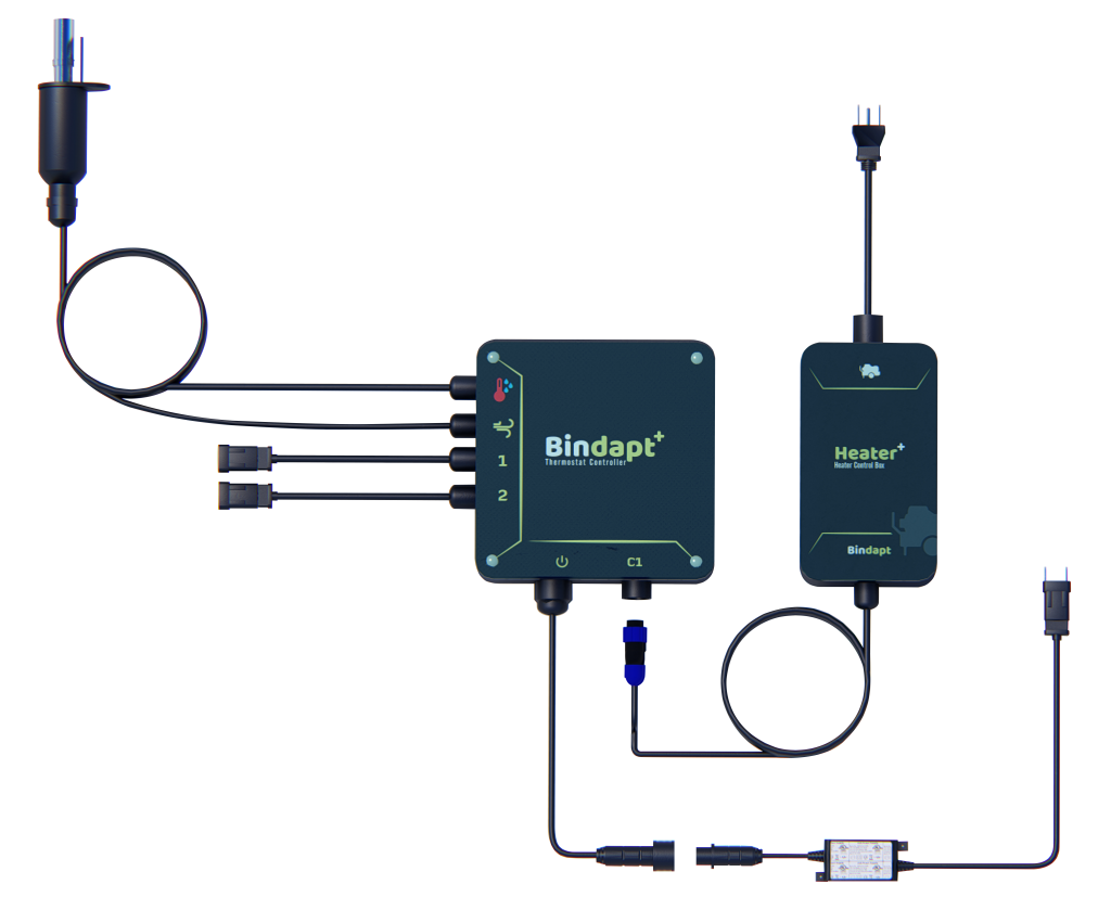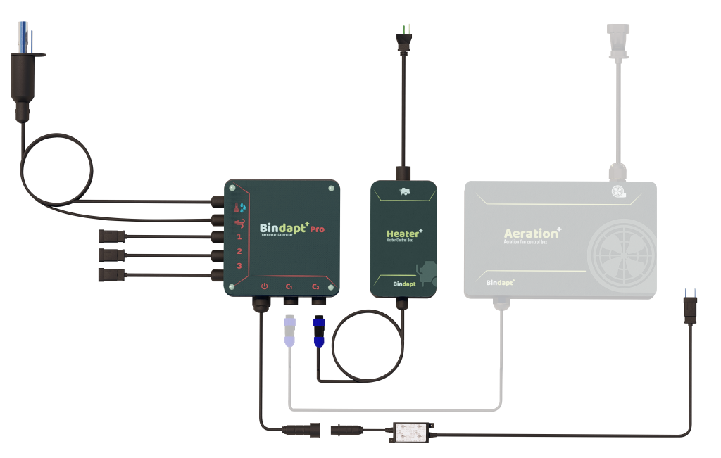 Modular Controllers (Aeration+, Heater+, and Exhaust+) attach to the output ports on the Bindapt+/Pro devices to automate / regulate its operation.